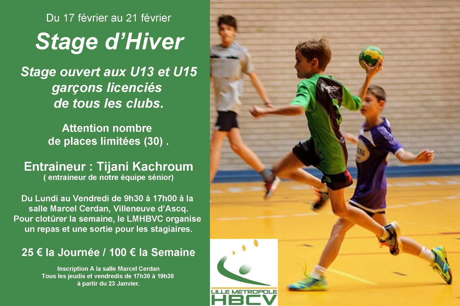 Stage ouvert aux U13 et U15 garçons licenciés de ous club. Du Lundi au vendredi de 9h30 à 17h00 à la salle cerdan, rue des comices, Villeneuve d'Ascq.